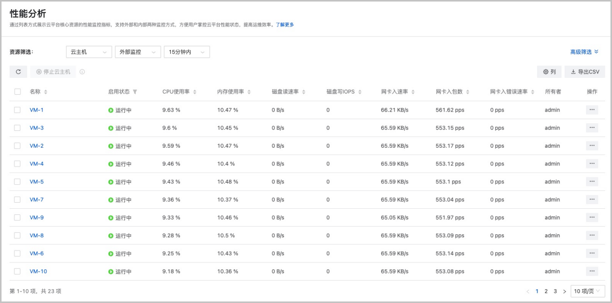 性能分析:通过列表方式展示云平台核心资源的性能监控指标,提供外部和内部两种监控方式,支持按资源查看性能分析结果和自定义导出分析报表,方便用户掌控云平台性能状态,提高运维效率。