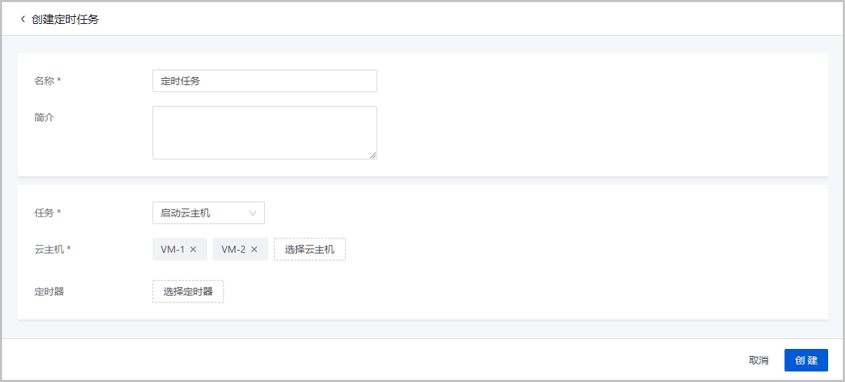 在ZStack Cloud主菜单,点击,进入定时任务界面。点击创建定时任务,弹出创建定时任务界面。