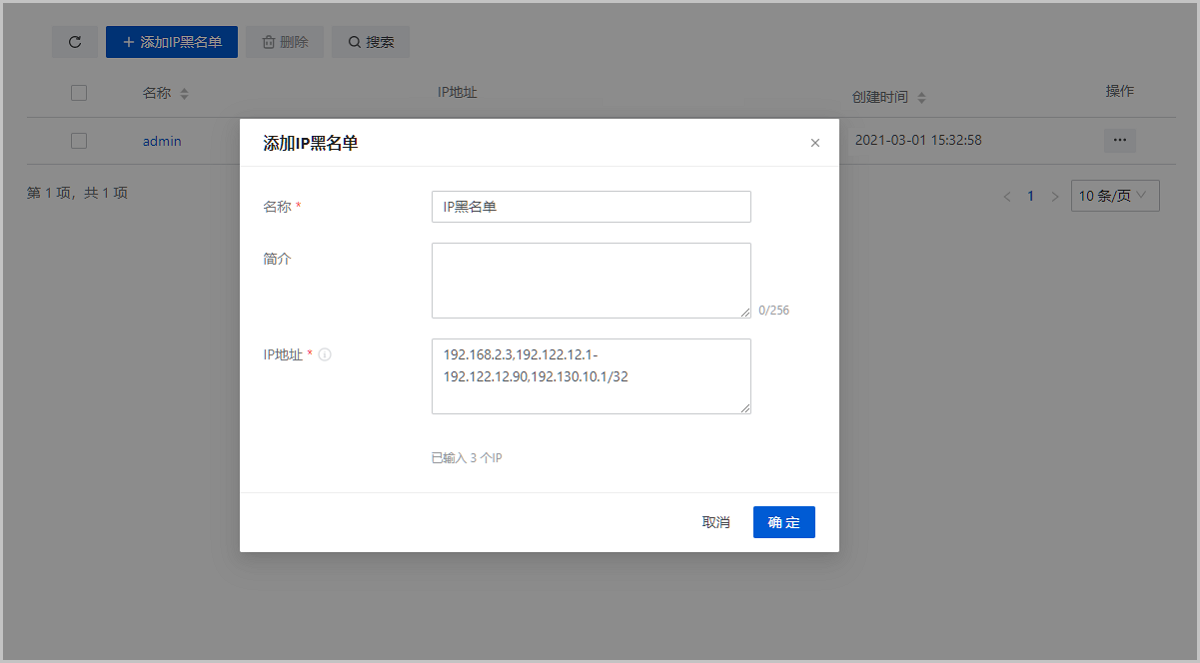 | 添加IP黑/IP白名单 | 添加一个新的IP黑/白名单。 说明: 添加IP黑/白名单,该名单将立即生效,名单中的IP地址将被拒绝/允许登录云平台,请谨慎操作。 |