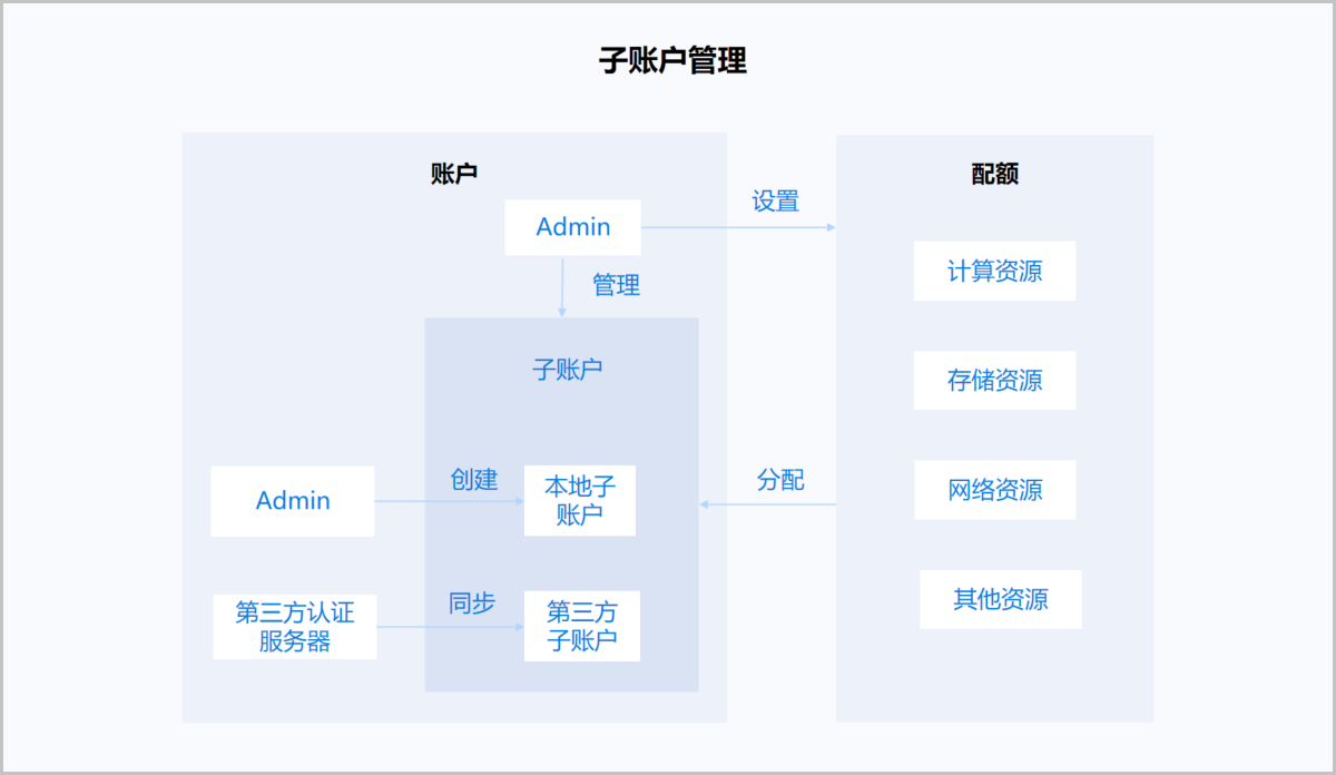 子账户:子账户由admin创建或第三方认证系统同步,且受admin管理,子账户对自己创建的虚拟资源拥有管理权限。子账户对作用域的资源可以进行创建、删除等操作,实现对资源归属及权限控制的细粒度划分。