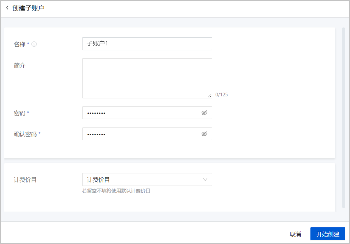 在ZStack Cloud主菜单,点击,进入子账户界面,点击创建子账户,弹出创建子账户界面。