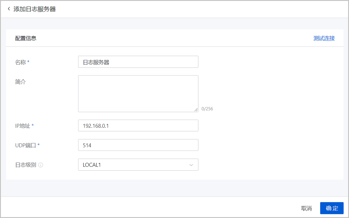 在ZStack Cloud主菜单,点击,进入日志服务器界面,点击添加日志服务器,弹出添加日志服务器界面。